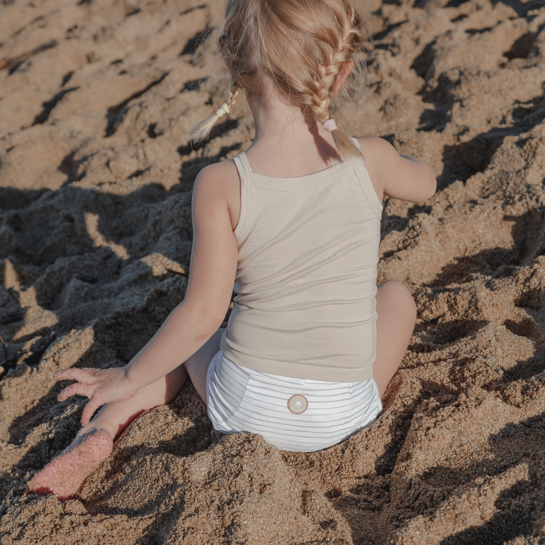 For instance, our swim diapers are made of recycled nylon Econyl®. We love this fabric. After all, it’s both soft and comfortable for babies and super sustainable because it is made with nylon waste collected from our oceans. It allows us to create fashionable items without having to use new resources. Regarding our absorbent pads, reusables wipes or tank tops, we use exclusively organic fabrics to create ingenious blends with Tencel, organic cotton, bamboo, and hemp.